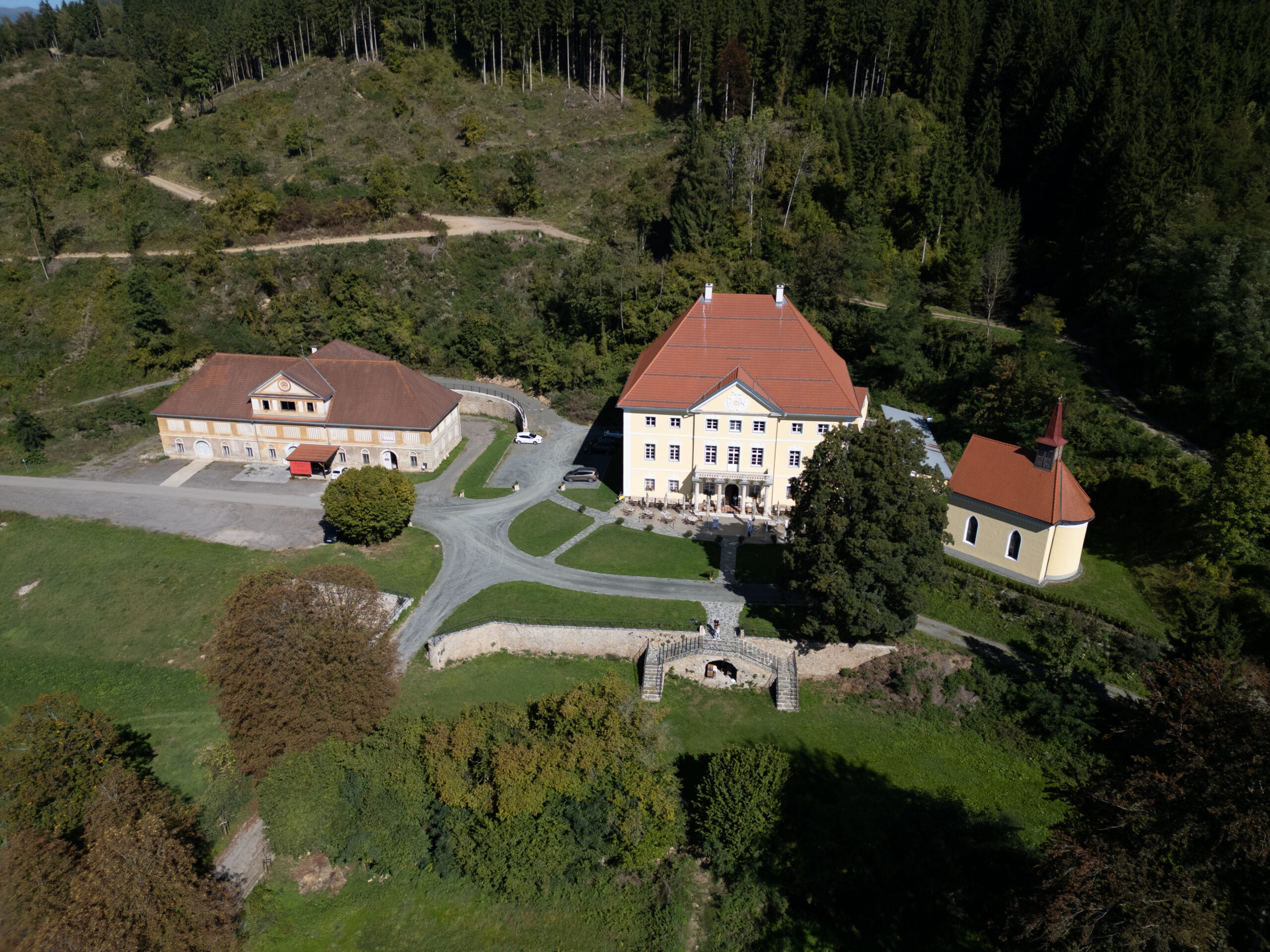 Genau genommen war es auch der Genuss, der die Familie Thaler ins Schloss Töscheldorf führte. Schon über zwanzig Jahre ist sie bekannt für ihr Bio-Catering. „Bis vor nicht allzu langer Zeit haben wir in einem Mini-Nebengebäude auf unserem Lacknerhof in Silberegg auf etwa 20 m² produziert“, erzählt Thaler. Die Familie suchte schon länger nach einem größeren Produktionsstandort – und fand ihn im Schloss Töscheldorf. Und noch mehr: Die private Schlosskapelle, ein kleiner Bau auf einer Terrasse südlich des Schlosses, bietet einen besonderen Rahmen für Hochzeiten oder Taufen. Der von Althofen gepachtete, dem Schloss vorgelagerte Park bietet eine idyllische Kulisse für Events jeder Art und lädt besonders während der Sommermonate zum Feiern ein. „Es freut uns, diesen historischen Ort mit Leben zu füllen und unseren Gästen unvergessliche Momente zu bereiten“, so Thaler. Ihre Familie hat es geschafft, die historische Seele des Schlosses zu bewahren und gleichzeitig einen modernen, einladenden Ort der Begegnung zu schaffen.